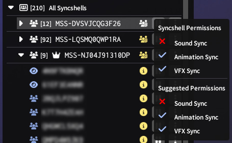 Для подключения к синкшеллу: во второй вкладке (с тремя человечками) нажать на кнопку Join existing Syncshell, ввести его ID и пароль. Можно находиться в 20 синкшеллах одновременно. Лимит одного синкшелла – 300 персонажей.